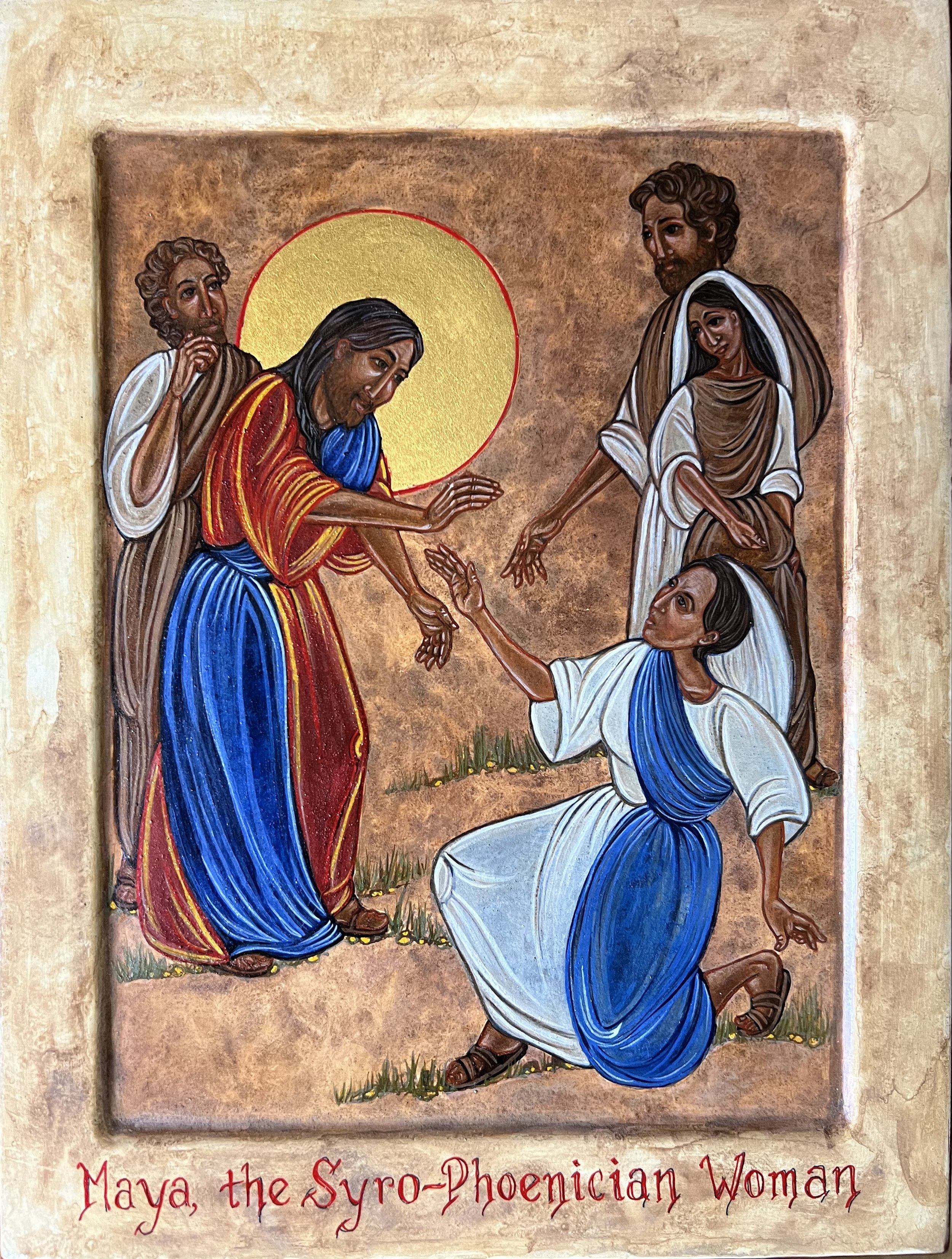 This icon tells the story of Jesus healing a woman who pursued him in a crowd to ask for healing.